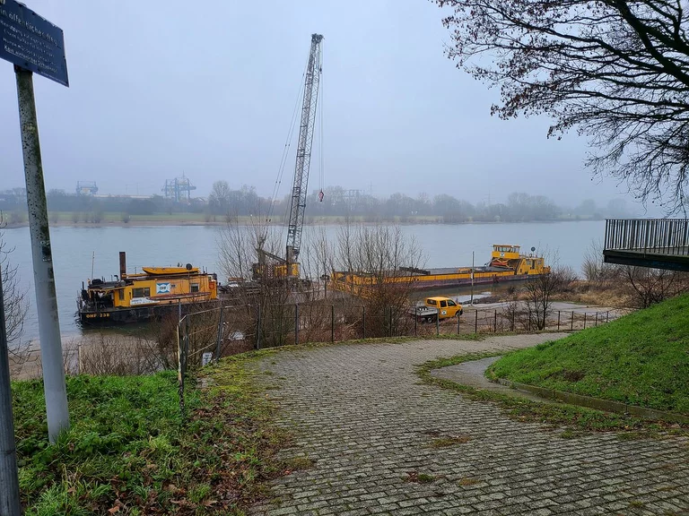 Mo. 26.1.26 18:00 Baustelle? Nö, Hafen! Zeit, den Wanheimer Hafen wieder auszubauen, so oft wie hier nun die Arbeiter ihre Autos rauf und runter, bis aufs "Schiff" fahren.